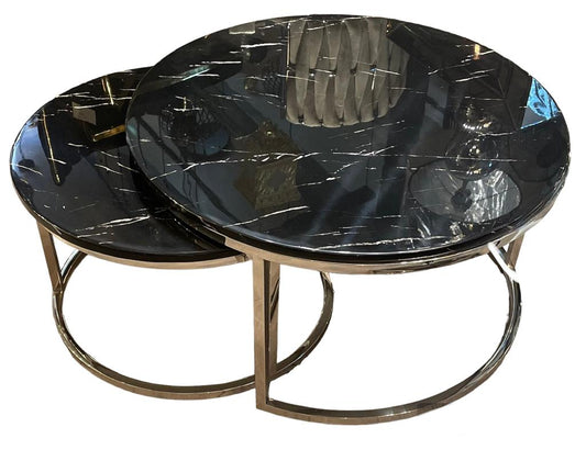 2-Delige Ronde Marmeren Salontafel (zwart/zilver)Ø80/60cm