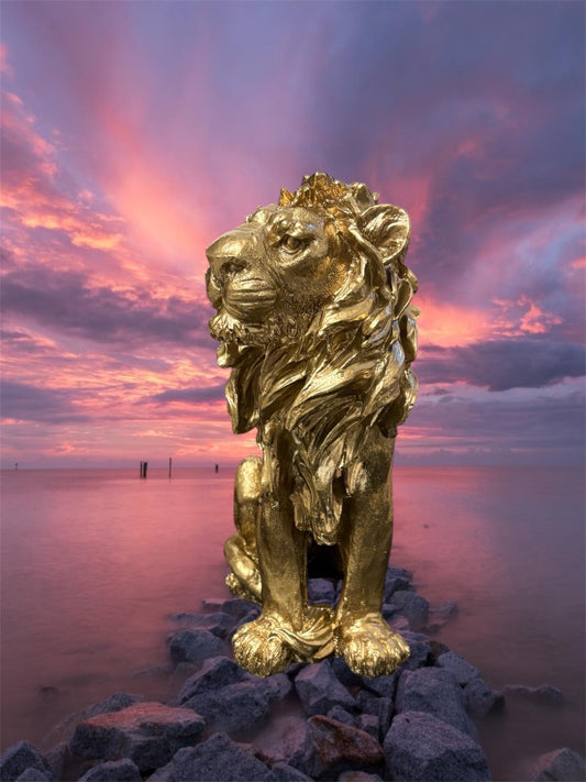 Gouden Leeuw Zittend Standbeeld, Hars Leeuw Leeuw Ewen hars leeuw h31.5, goud Leeuw beeld ornament Leeuw Léon