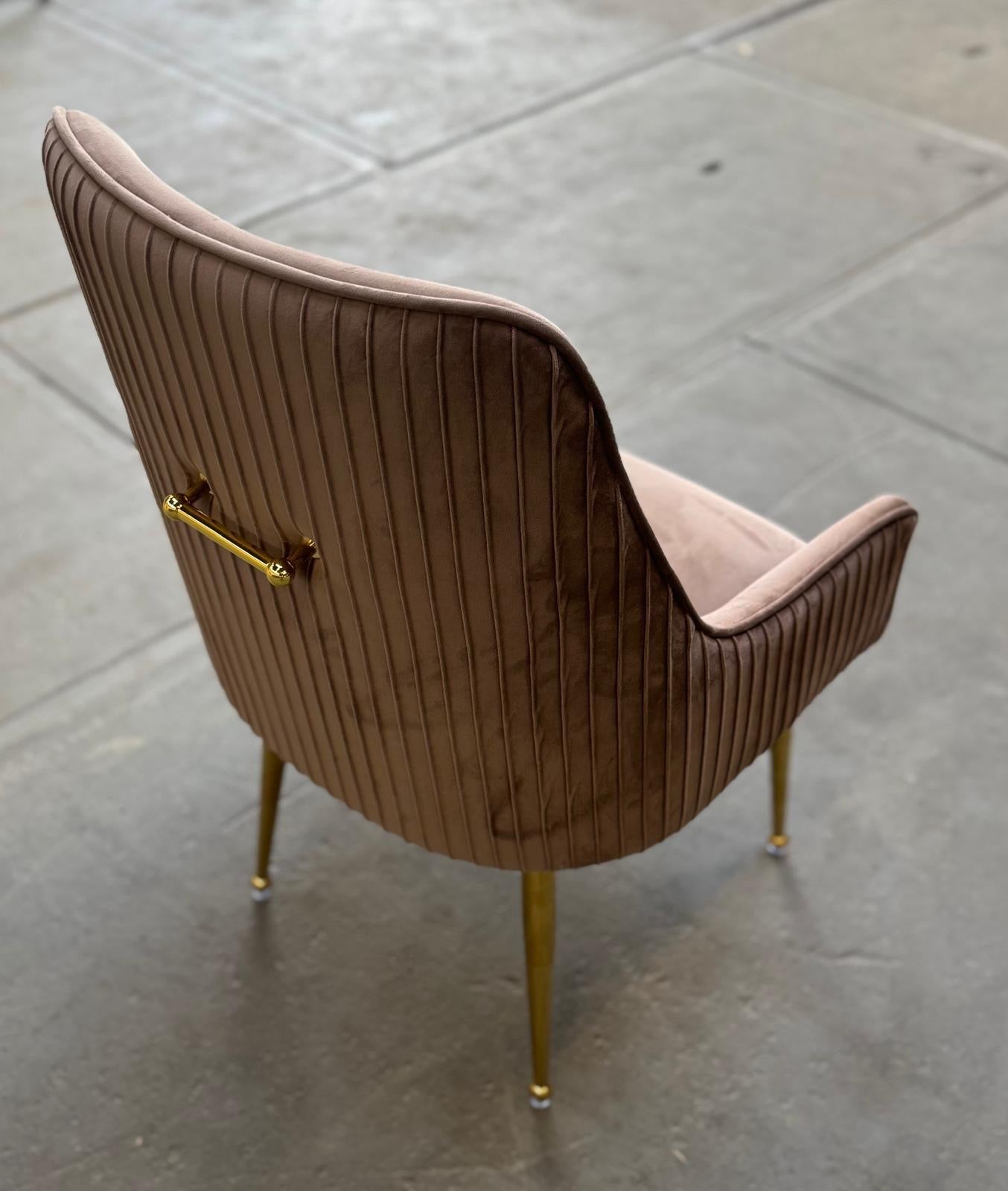 Eetkamerstoelen kopen? in het licht bruin met gouden poten en dikke stof.