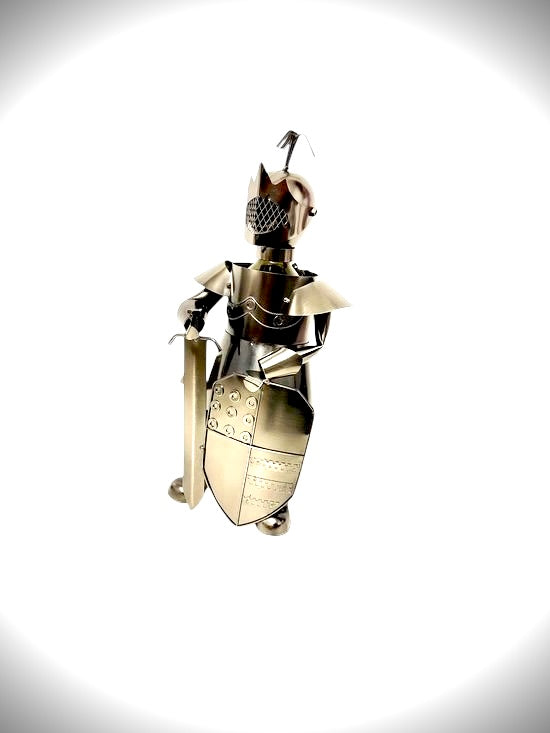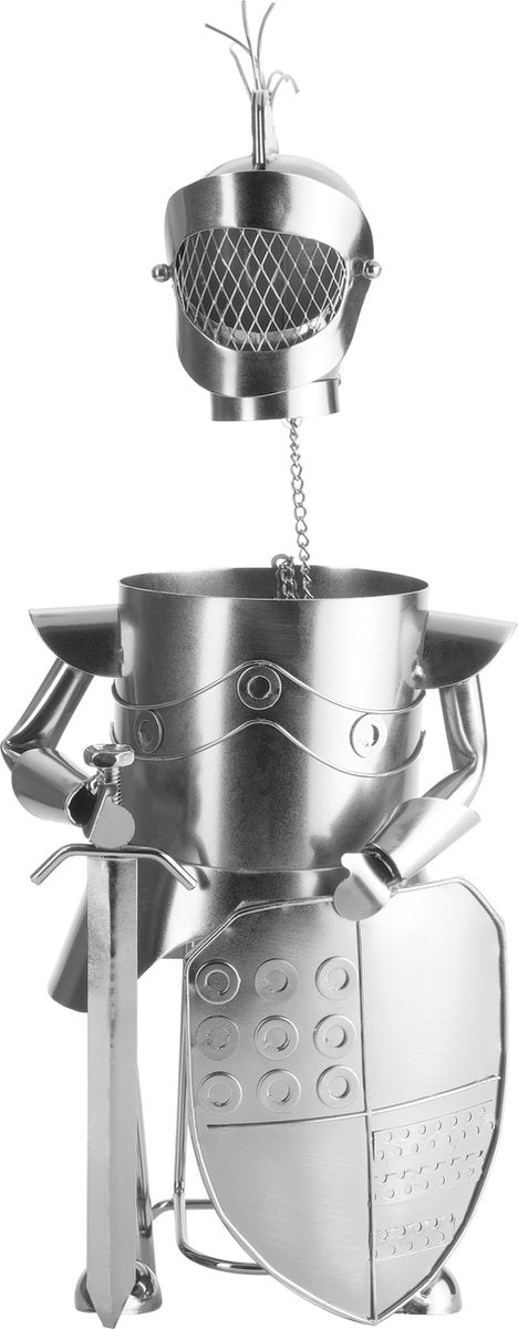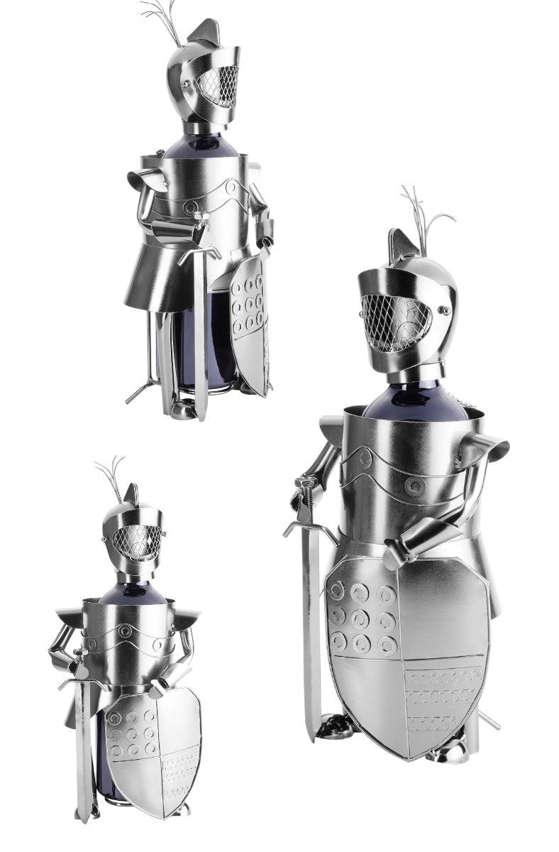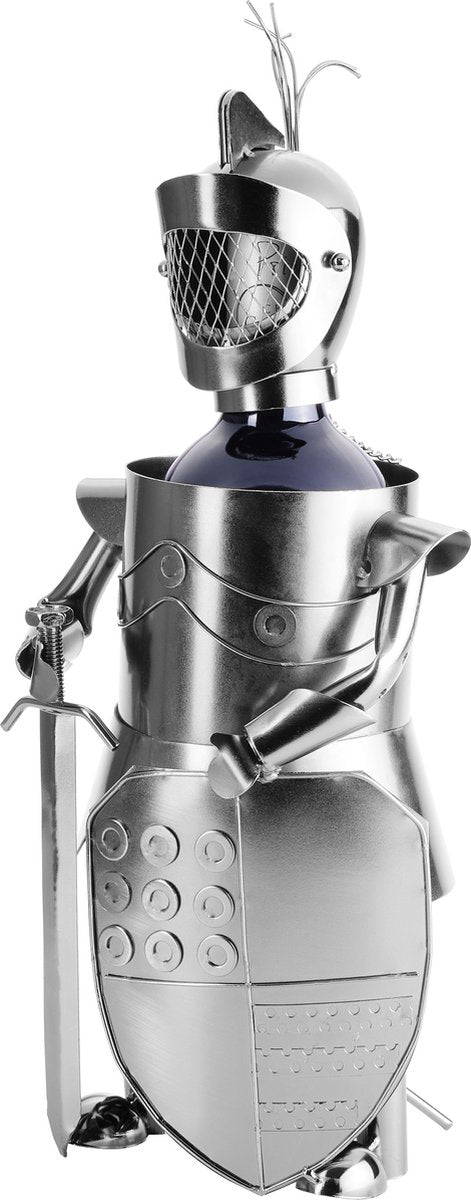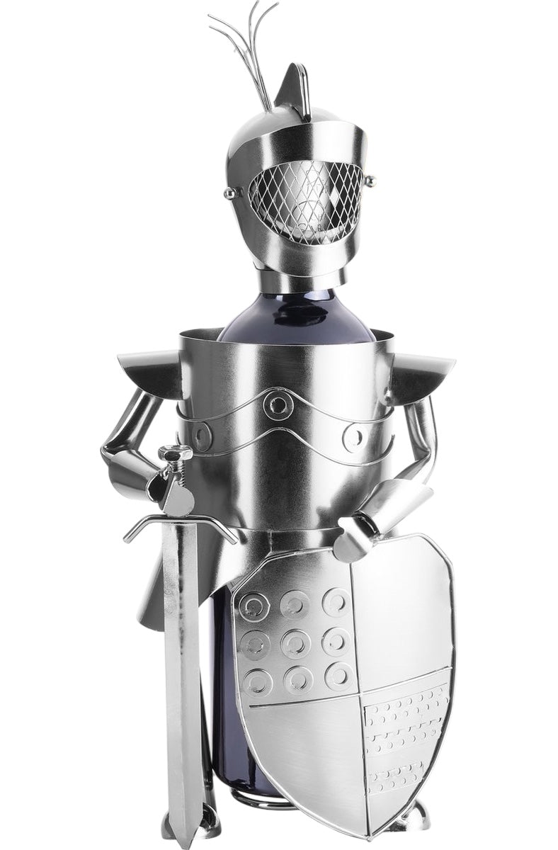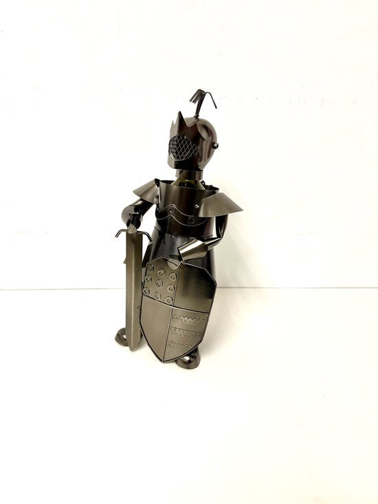 Mooie bruine ijzeren flessenhouder voor 1 fles, in de vorm van een Ridder , met een industriële uitstraling.