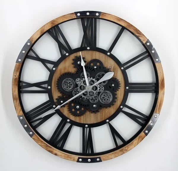 Wandklok met Romeinse cijfers en draaiende tandwielen.